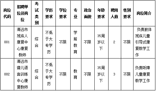 清遠(yuǎn)市殘疾人康復(fù)中心、清遠(yuǎn)市聾兒語言訓(xùn)練中心,是市殘聯(lián)直屬公益一類事業(yè)單位,是專門為0-6歲殘障兒童康復(fù)的機(jī)構(gòu)。根據(jù)工作需要招聘康復(fù)教師5名(屬非編制人員,不列入用人單位編制序列,不擔(dān)任行政職務(wù)),現(xiàn)將有關(guān)事項(xiàng)公告如下: