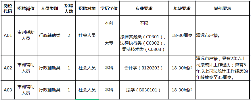 根據(jù)工作需要,清遠(yuǎn)市清城區(qū)人民法院現(xiàn)面向社會(huì)公開招聘專項(xiàng)工作聘員4名。具體崗位設(shè)置如下: