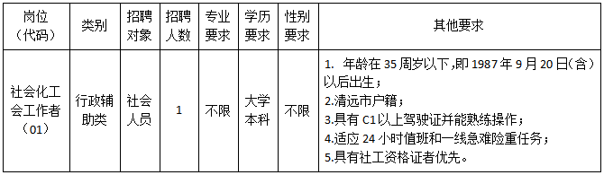 因工作需要,現(xiàn)清城區(qū)總工會面向社會公開招聘1名社會化工會工作者(屬非編制人員,不列入用人單位編制序列,不擔任行政職務(wù)),現(xiàn)將有關(guān)事項公告如下: