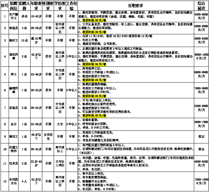公司發(fā)展需要增加新生產線,現(xiàn)招聘職位如下: