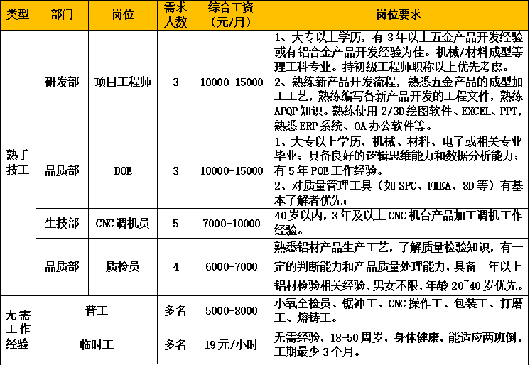公司擁有廣東省唯一的鋁車體工程技術研究中心!扳伱冷X材”品牌先后獲得鋁型材行業(yè)內的最高榮譽:“中國馳名商標”、“中國著名品牌”、“中國名優(yōu)產品”;公司榮獲“國家高新技術企業(yè)”、廣東省“專精特新”企業(yè)等榮譽稱號。因生產發(fā)展需要,誠聘以下崗位: