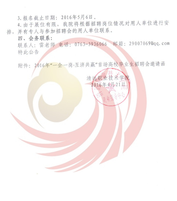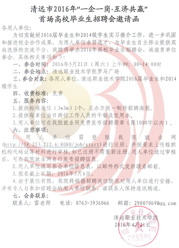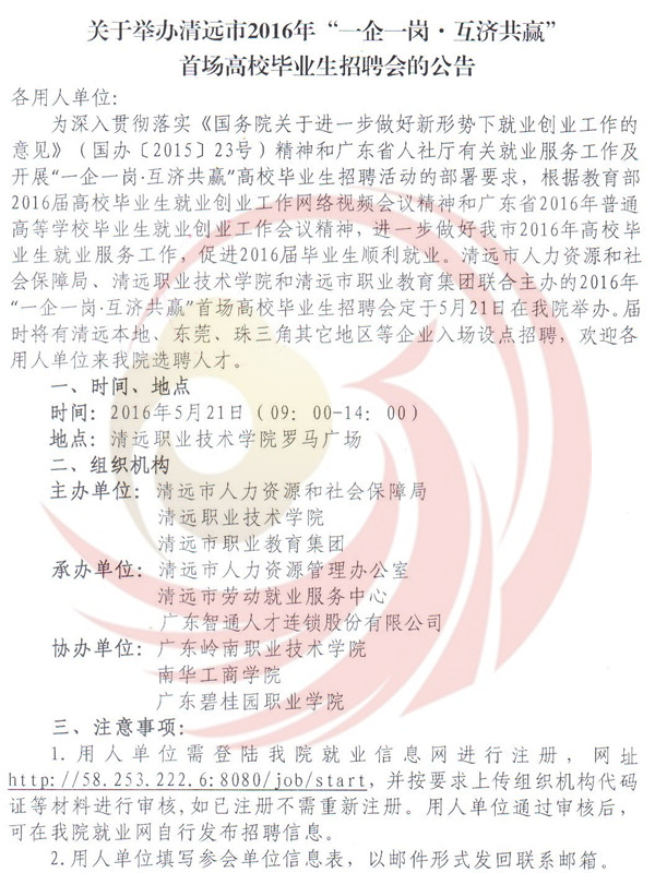 為深入貫徹落實(shí)《國(guó)務(wù)院關(guān)于進(jìn)一步做好新形勢(shì)下就業(yè)創(chuàng)業(yè)工作的意見(jiàn)》(國(guó)辦﹝2015﹞23號(hào))精神和廣東省人社廳有關(guān)就業(yè)服務(wù)工作及開展“一企一崗▪互濟(jì)共贏”高校畢業(yè)生找屁活動(dòng)的部署要求,根據(jù)教育部2016屆高校畢業(yè)生就業(yè)創(chuàng)業(yè)工作網(wǎng)絡(luò)視頻會(huì)議精神和廣東省2016年普通高等學(xué)校畢業(yè)生就業(yè)創(chuàng)業(yè)工作會(huì)議精神,進(jìn)一步做好我市2016年高校畢業(yè)生就業(yè)服務(wù)工作,促進(jìn)2016屆畢業(yè)生順利就業(yè)。清遠(yuǎn)市人力資源四川和社會(huì)保障局,清遠(yuǎn)市職業(yè)技術(shù)學(xué)院和清遠(yuǎn)市職業(yè)教育集團(tuán)聯(lián)合主辦的2016年“一企一崗▪互濟(jì)共贏”首場(chǎng)高校畢業(yè)生招聘會(huì)定于5月21日在清遠(yuǎn)市職業(yè)技術(shù)學(xué)院舉辦,屆時(shí)將有清遠(yuǎn)本地、東莞、珠三角其他地區(qū)等企業(yè)入場(chǎng)設(shè)點(diǎn)招聘,歡迎各用人單位到清遠(yuǎn)市職業(yè)技術(shù)學(xué)院選聘人才。